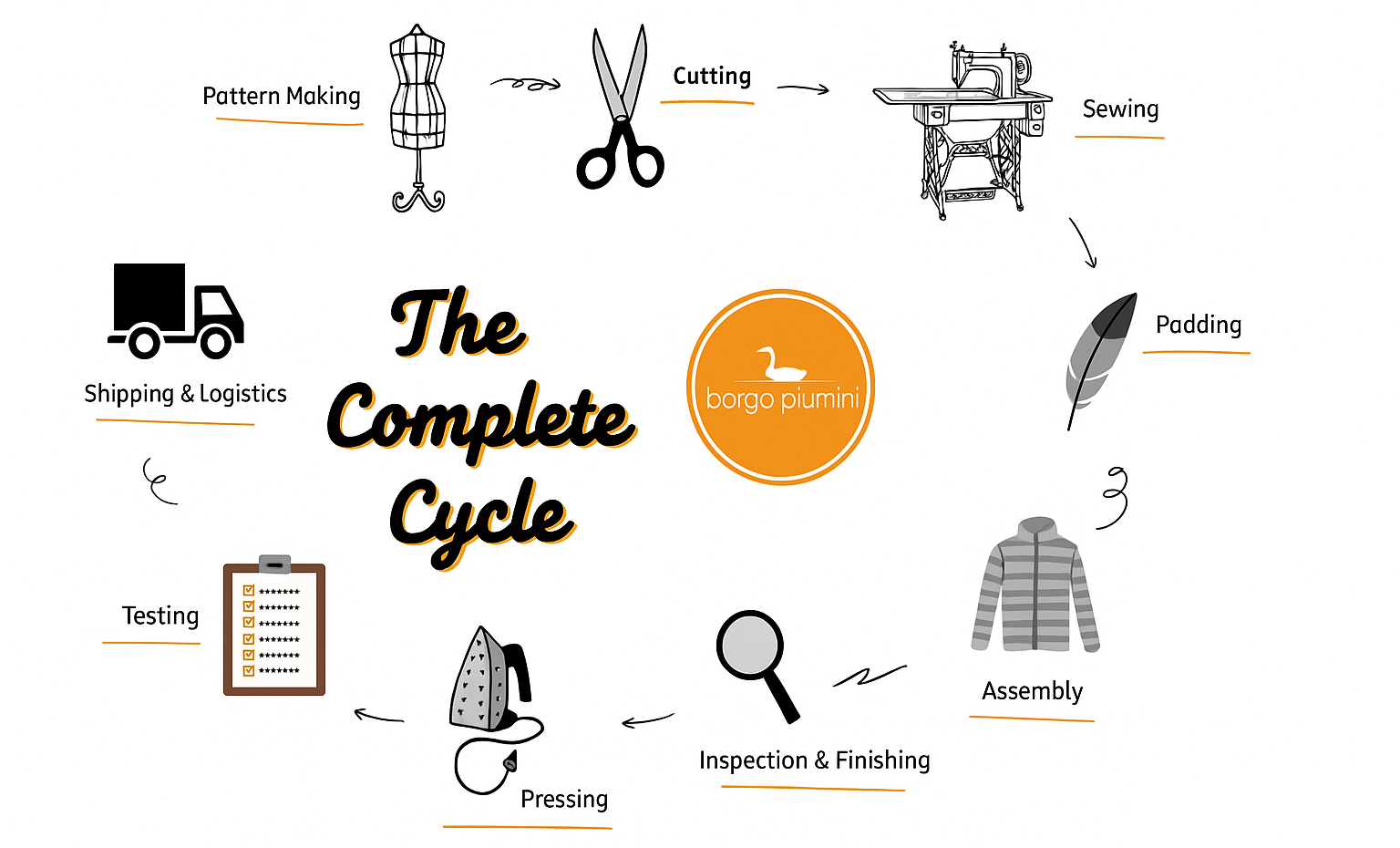 Alongside its traditional production of down interiors, BORGO PIUMINI also offers the possibility of manufacturing finished garments through production units directly supervised by the company’s headquarters.